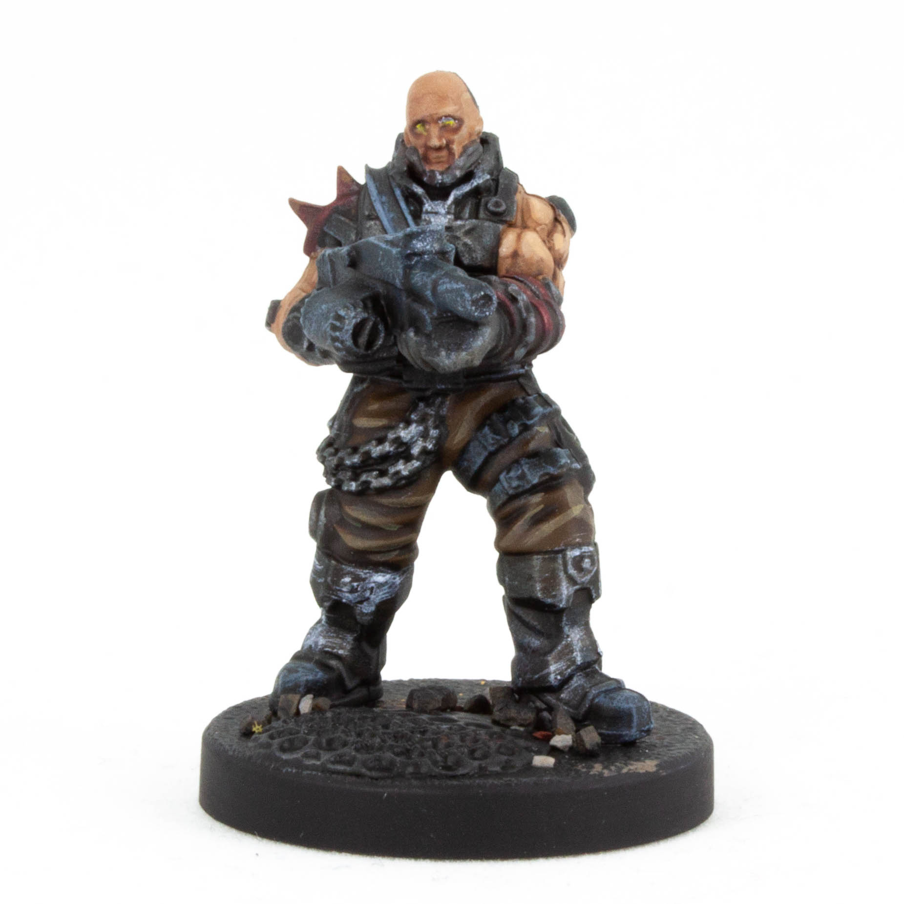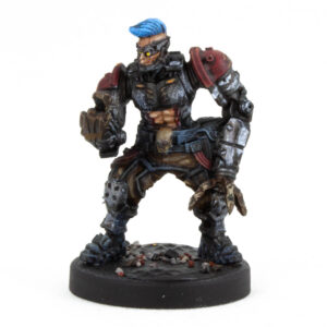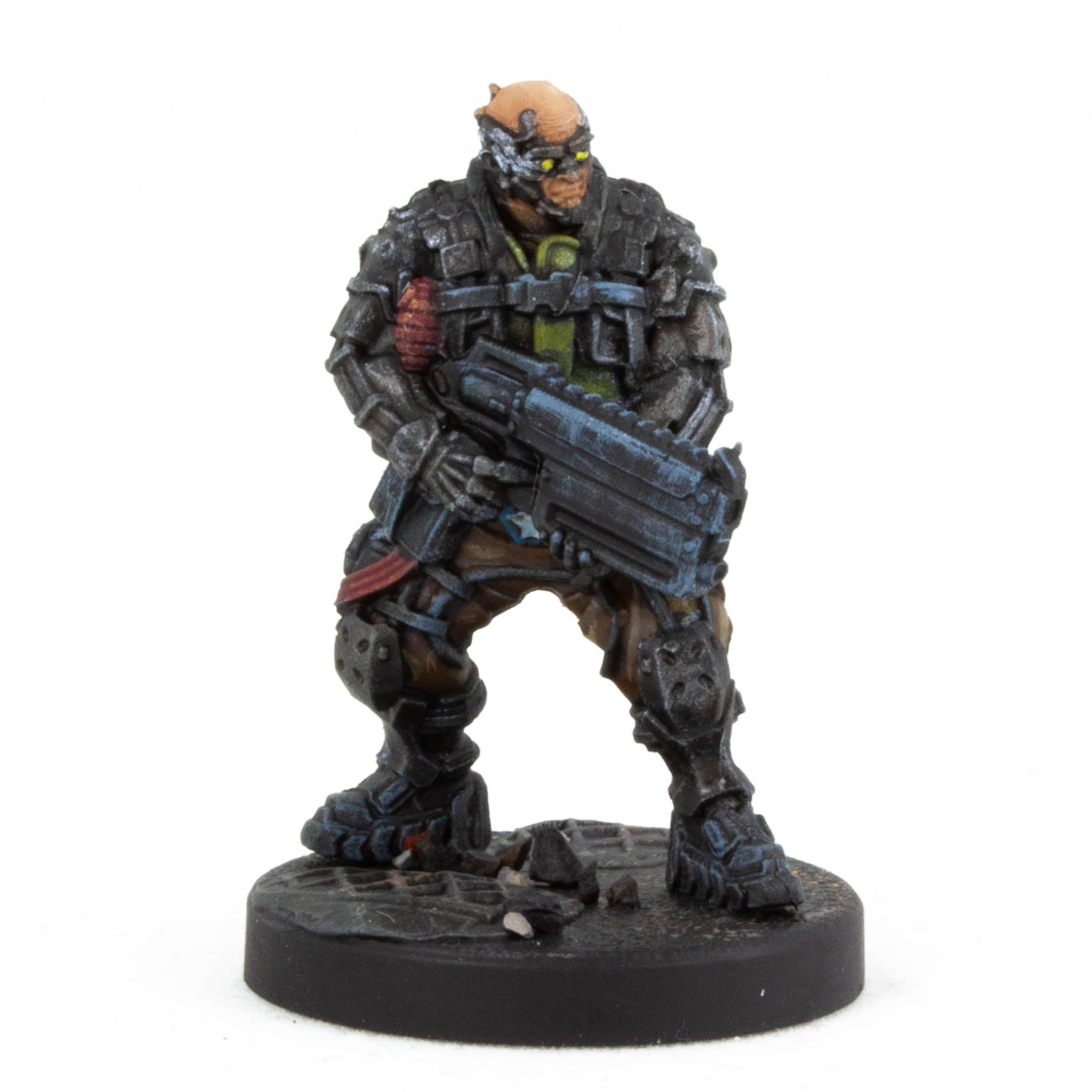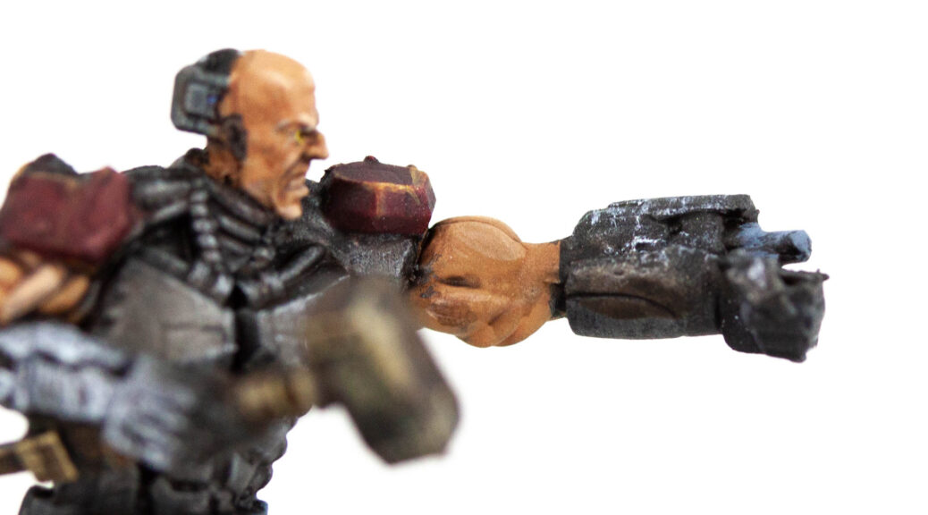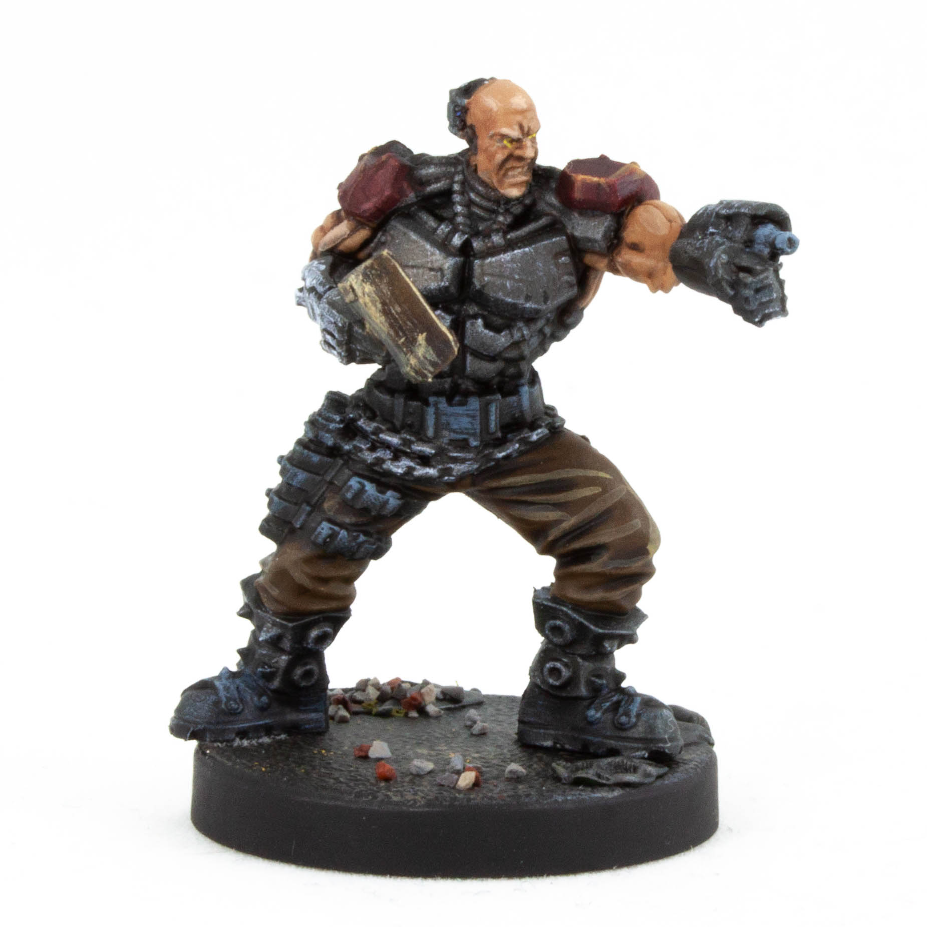 This head had a bubble in the casting. I decided to lean into it, carving it out and painting it metal. Some head injury that got a cyber repair.